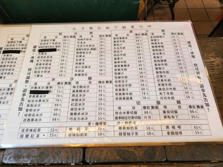 進店內找好位子後就來看看菜單,主要分成五大區塊,分別為刨冰類、冰沙類、果汁類、切盤類及茶、咖啡類。