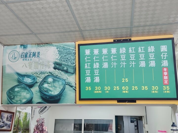 進店內找好位子後就來看看菜單,有綠豆湯、紅豆湯、紅豆汁、綠豆汁、薏仁汁、薏仁湯、薏仁綠豆湯及薏仁紅豆湯,冬季的話還有圓仔湯。