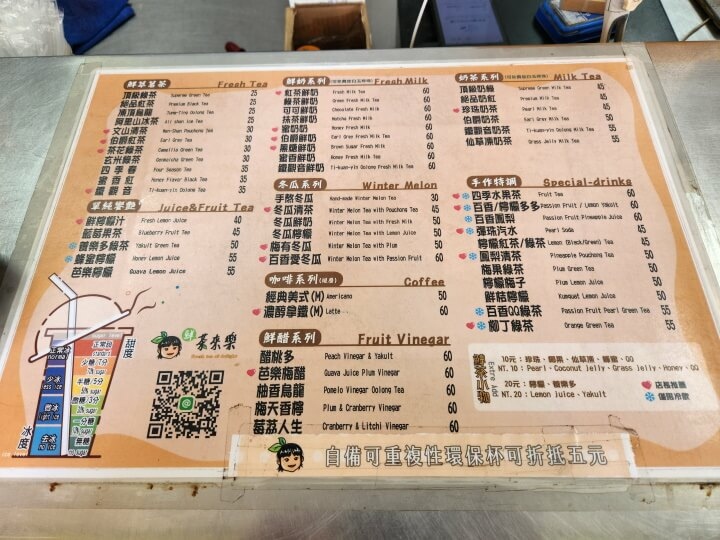 抵達目的地後先來看看菜單,飲品部分分成八大區塊,分別是鮮萃茗茶、單純饗艷、鮮奶系列、冬瓜系列、咖啡系列、鮮醋系列、奶茶系列及手作特調。