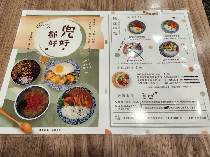 進店內找好位子後就來看看菜單,正面是健康料理,包含咖哩系列、沙拉&輕食系列及升級套餐。