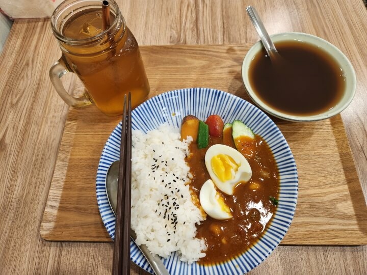 點完餐沒多久,學習家Manor我的鷹嘴豆番茄咖哩飯套餐上桌了,咖哩口味適中且食材新鮮,另外升級套餐有飲料及甜品,飲料部分,蘋果醋滿大杯的,甜品方面,紅豆湯甜度剛剛好,滿不賴的。