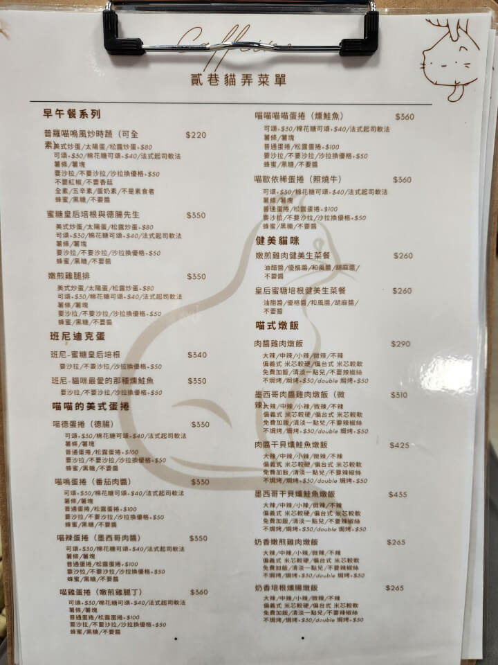 進店內找好位子後就來看看菜單,首先是早午餐系列、班尼迪克蛋、喵喵的美式蛋捲、健美貓咪及喵式燉飯。