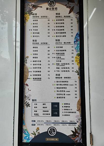 抵達目的地後先來看看菜單,飲品部分分成五大區塊,分別是茶香、果香、奶香、特香及料香。