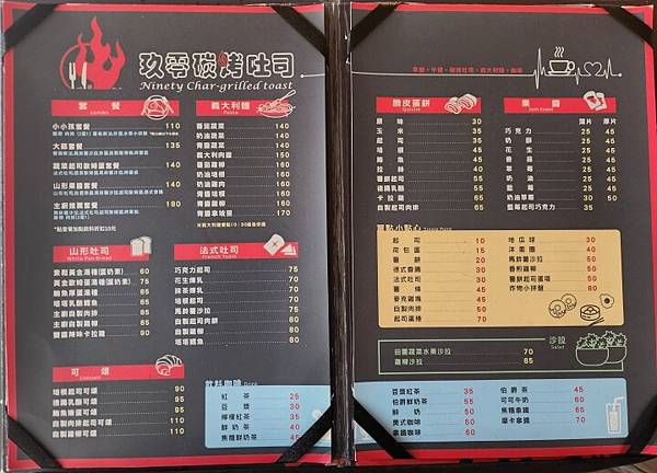 進店內找好位子後就來看看菜單,主要分成十大區塊,分別為套餐、山形吐司、可頌、義大利麵、法式吐司、脆皮蛋餅、果醬、單點,小點心、沙拉及飲料,咖啡。