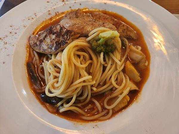 點完餐沒多久,學習家Manor我的番茄雞柳義大利麵先上桌,義大利麵份量不少外,雞柳也不賴,平常口味若吃重一些,也可以加點辣油提味。
