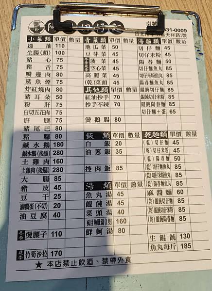 進店內找好位子後就來看看菜單,主要分成七大區塊,分別為小菜類、青菜類、其他類、飯類、湯類、湯麵類及乾麵類。