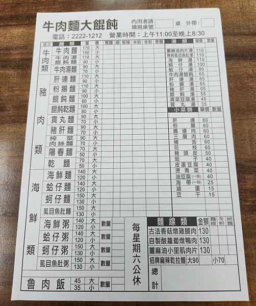 進店內找好位子後就來看看菜單,主要分成五大區塊,分別為麵類(牛肉類、豬肉類及海鮮類)、湯類、小菜類、麵線類及魯肉飯。