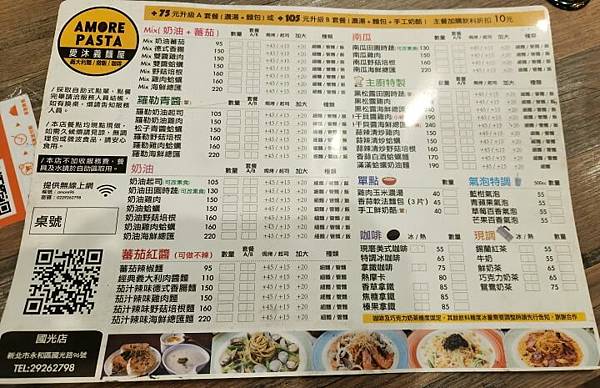 菜單主要分成十大區塊,分別為Mix(奶油+番茄)、羅勒青醬、奶油、番茄紅醬、南瓜、主廚特製、單點、氣泡特調、咖啡及現調。