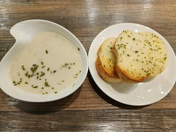 點完餐沒多久,學習家Manor我的麵包及濃湯先上桌,麵包剛烤好口感還不賴,濃湯部分濃稠適中。