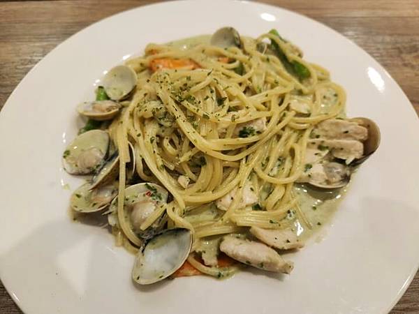 接著是羅勒雞肉蛤蠣義大利麵,醬汁味道十足外,蛤蠣給的也不少顆。