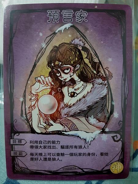‧預言家(神職):每個夜晚可以查驗一名玩家所屬陣營,得知其為好人或狼人。