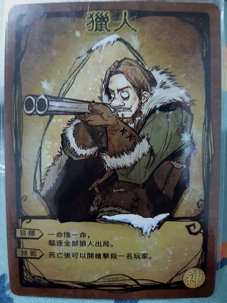 ‧獵人(神職):出局時白天可以發動技能開槍帶走一名玩家(但吃毒則不能開槍),亦可選擇壓槍不發動技能。
