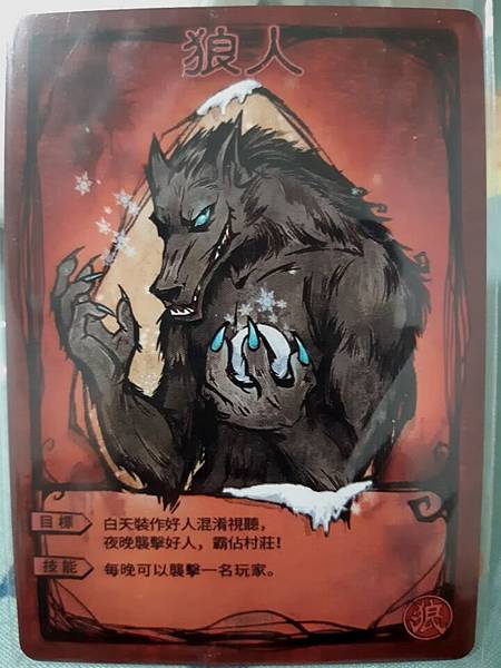 ‧狼人(狼隊)x3:夜裡可與狼隊友討論後殺害一名玩家,白天自爆可以強制進入天黑。