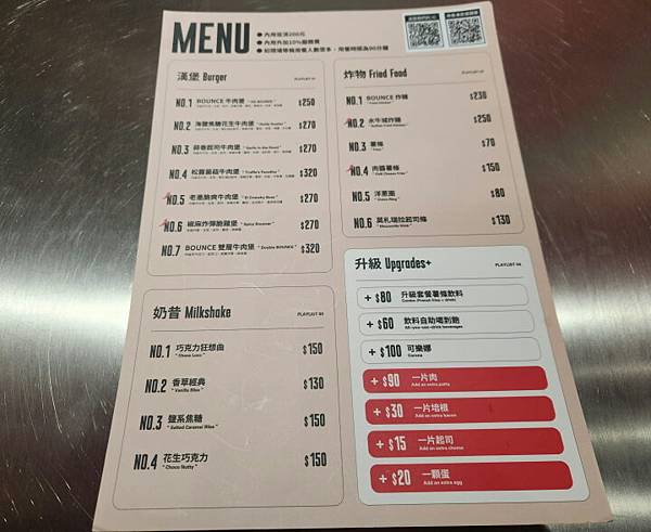 進店內找好位子後就來看看菜單,主要分成四大區塊,分別為漢堡、炸物、奶昔及升級。