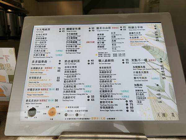 抵達目的地後先來看看菜單,飲品部分分成八大區塊,分別是今天喝純茶、多多協奏曲、醋醋皆有禮、奶去碰到茶、醋茶自由搭、職人級鮮奶、特調古早味及來點不一樣。