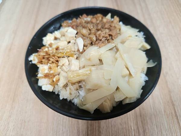 點完餐沒多久,學習家Manor我的小碗綜合飯先上桌,白飯上的肉燥及雞肉各半外,上頭還加點筍絲,吃起來還不賴。