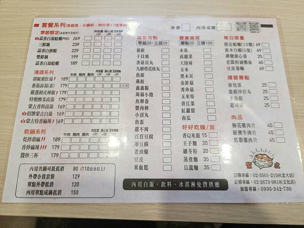 進店內找好位子後就來看看菜單,主要分成九大區塊,分別為季節限定、湯頭系列、乾鍋系列、精華加點、健康蔬菜、好好吃麵/飯、每日限量、爆漿單點及肉品。