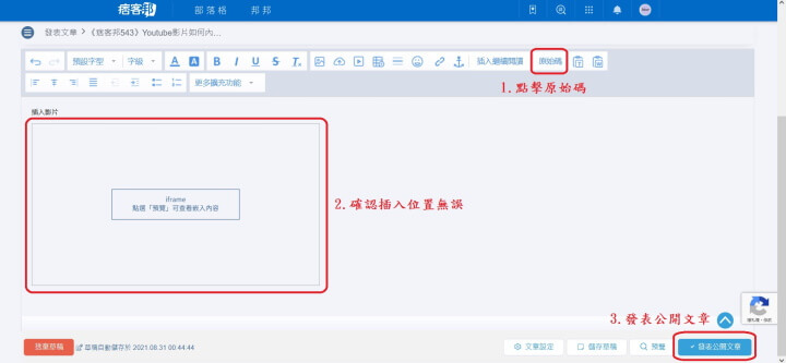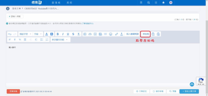 6.再點選一次原始碼,回到編輯文章內容區塊,確定插入位置無誤後,發表公開文章。