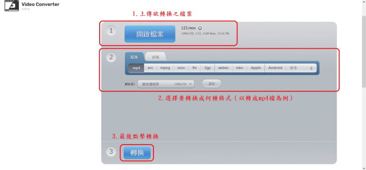 1. 將欲轉換之影片上傳該網站(以mov檔轉mp4檔為例)後點擊轉換。