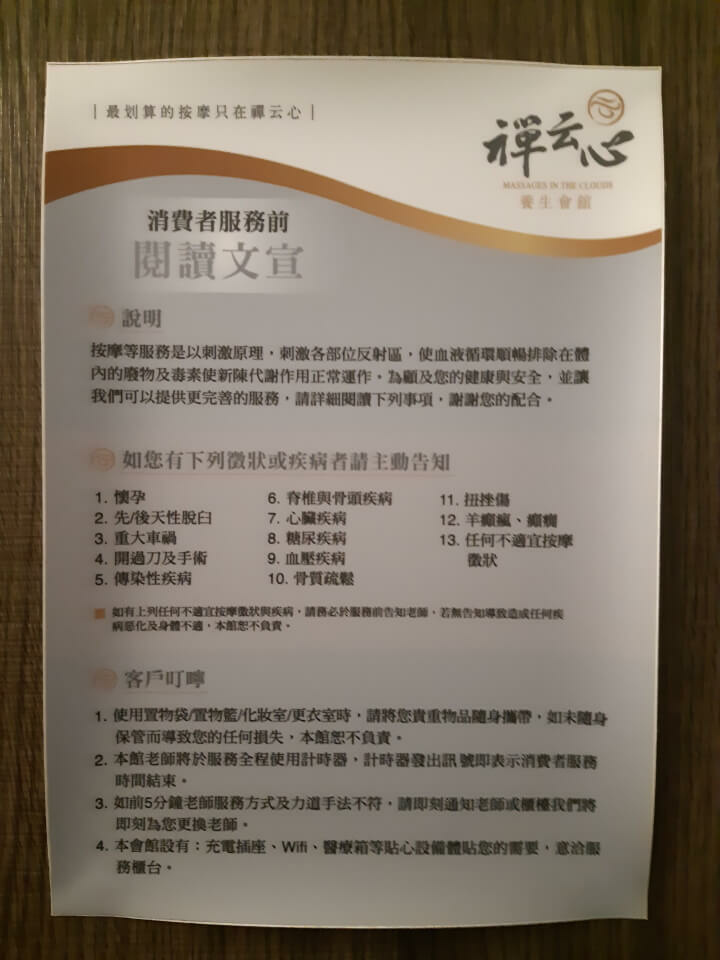 它位於捷運古亭站附近(和平西路與南昌路轉角處),以交通而言很方便,去之前記得先打電話預約(現場可能要等好一陣子),在約定的時間抵達後,進門會先換拖鞋,而按摩前也會給短褲做更換,在更衣間時有一些注意事項可以留意一下,確認自己有沒有以下疾病喔!