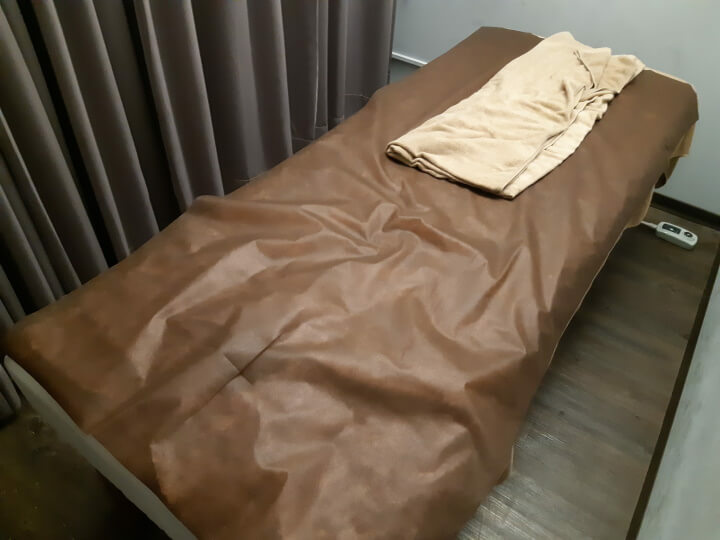 接著就是全身按摩,進到裡面的房間,每個床都有簾子隔開也有置物的籃子(挺貼心的),然後頭靠洞裏面朝下躺著,床就如下圖所示。