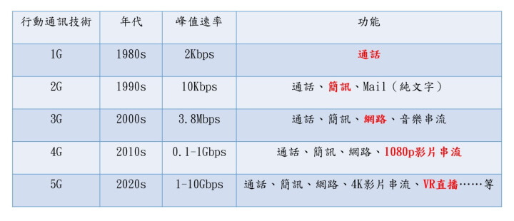 行動通訊技術的發展,除了峰值速率的增加外,功能部分亦更加進步(紅字部分是與上一代行動通訊技術差異之處),若單就4G與5G的比較,理論上5G網路速度能比4G快上100倍。