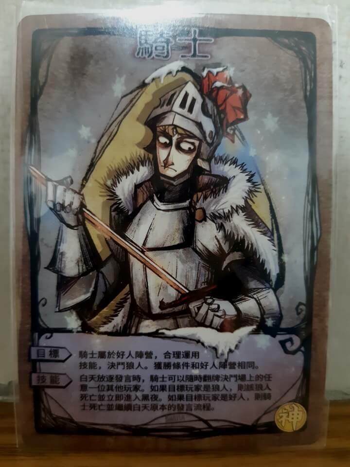 ‧騎士(神職):可以在白天投票前的任何時候(上警階段除外)翻出底牌,指定一名玩家進行決鬥,若該玩家底牌為狼人,該玩家死亡且立即進入黑夜,若該玩家底牌為好人,騎士死亡且白天環節繼續(原被打斷發言的玩家可以繼續發言)。