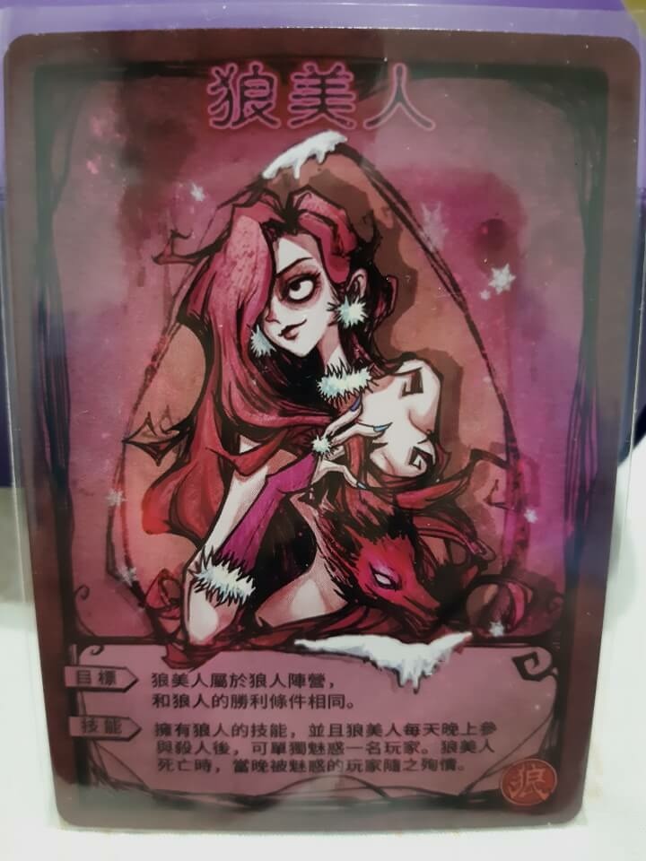 ‧狼美人(狼隊):夜裡參與狼隊擊殺對象後,選擇一名要魅惑的玩家,白天狼美人出局或夜裡死亡(吃毒),魅惑的玩家隨之殉情(不能連續兩晚魅惑同一名玩家、狼美人不能自刀),但若被騎士決鬥則技能無法發動。