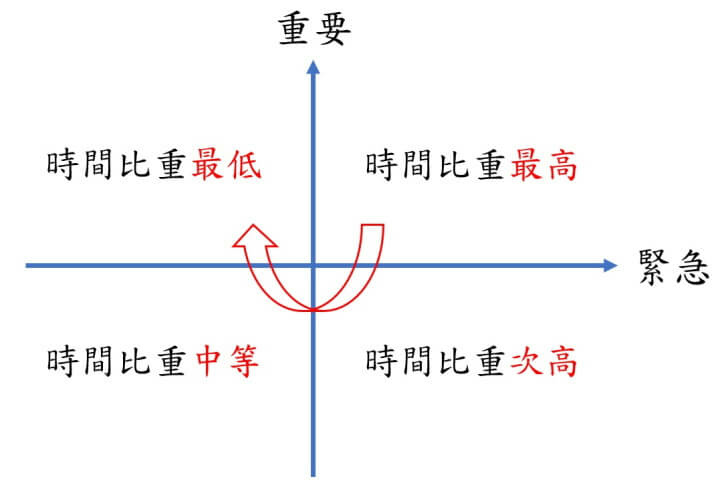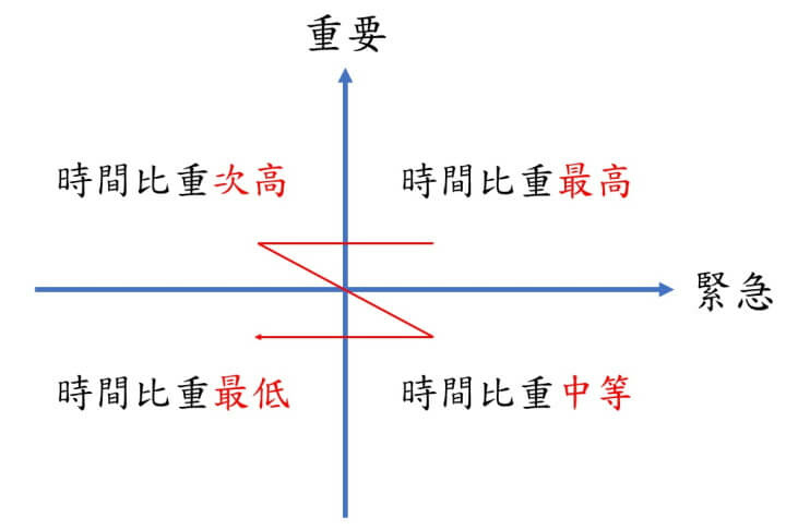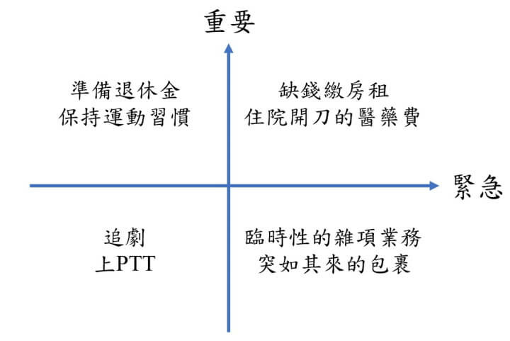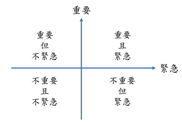 相信大家以前數學課應該學過X-Y軸座標,可以畫出四個象限,只是這裡的X軸為緊急、Y軸為重要,故可以將四個象限解讀出重要且緊急、重要但不緊急、不重要且不緊急、不重要但緊急的事。