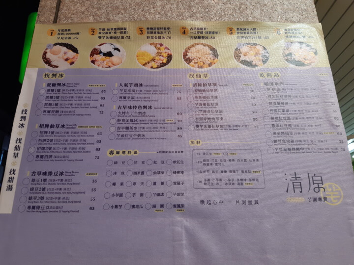 抵達目的地後先來看看菜單,上半部是冰品部分,分成五大區塊,分別為找挫冰、找仙草、吃熱品、專屬選料區及加料。