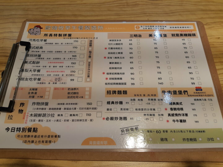 進店內找好位子後就來看看菜單,正面有所長特製拼盤、三明治/美式漢堡/黑糖饅頭、炸物沙拉、招牌麵麵、牛肉堡堡們及今日特別餐點。