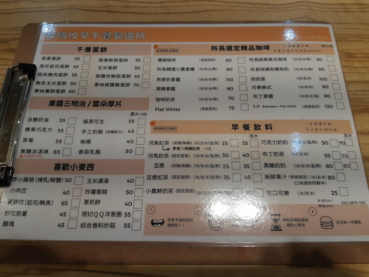 背面則是千層蛋餅、果醬三明治/雲朵厚片、喜歡小東西、所長選定精品咖啡及早餐飲料。