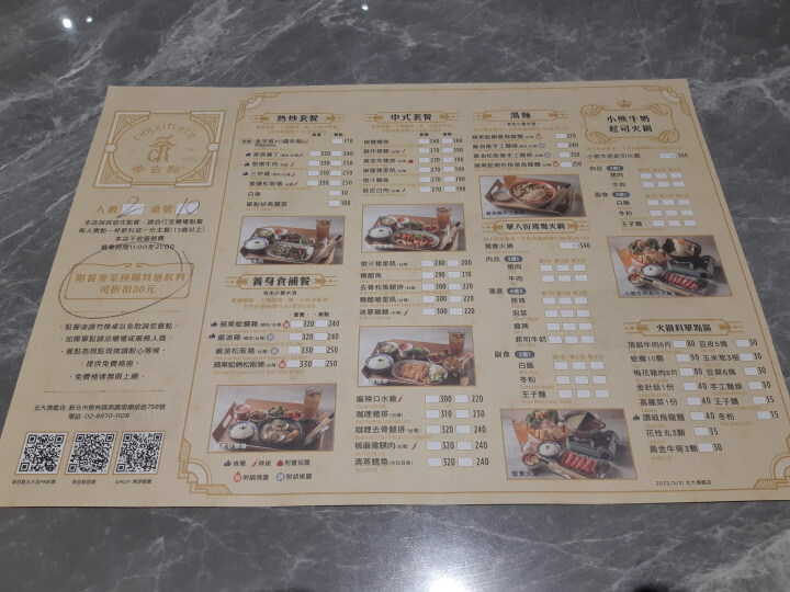 進店內等店員帶位入座後就來看看菜單,正面有熱炒套餐、養身食補餐、中式套餐、湯麵、單人份鴛鴦火鍋、小熊牛奶起司火鍋及火鍋料單點區。