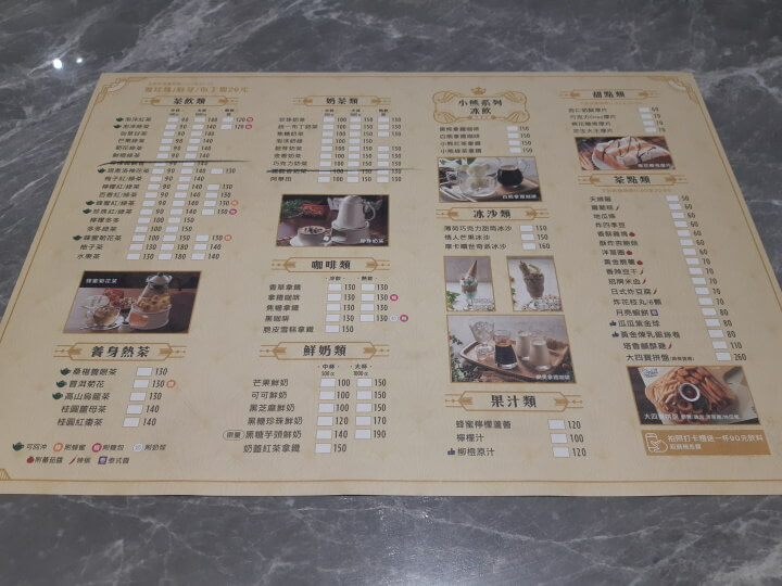 背面則是茶飲類、養身熱茶、奶茶類、咖啡類、鮮奶類、小熊系列冰飲、冰沙類、果汁類、甜點類及茶點類。