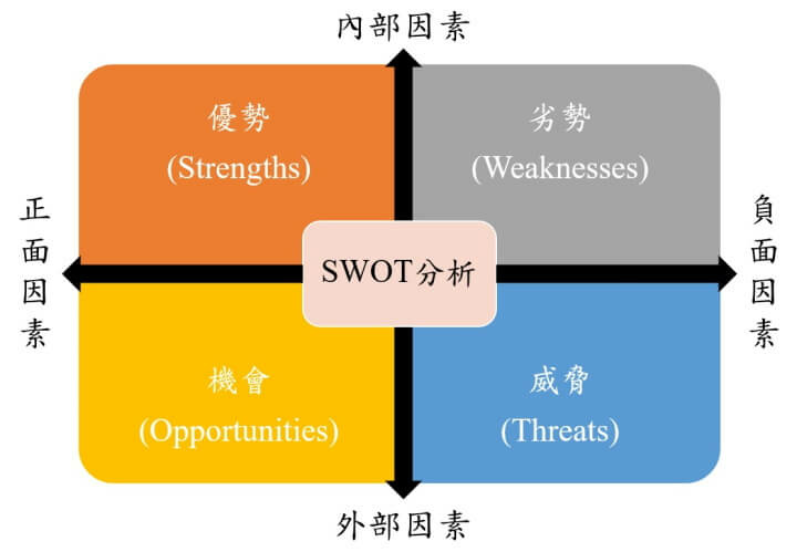 SWOT分析又稱強弱危機分析、優劣分析、道斯矩陣,是由優勢(Strengths)、劣勢(Weaknesses)、機會(Opportunities)及威脅(Threats)等四個元素組成,當中又可歸類成內部因素(優勢S、劣勢W)、外部因素(機會O、威脅T)、正面因素(優勢S、機會O)及負面因素(劣勢W、威脅T)。