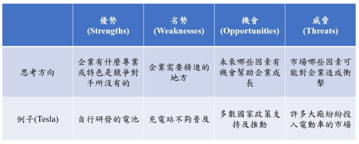 以特斯拉(Tesla)為例,優勢為自行研發的電池、劣勢為充電站不夠普及、機會為多數國家政策支持及推動、威脅為許多大廠紛紛投入電動車的市場。