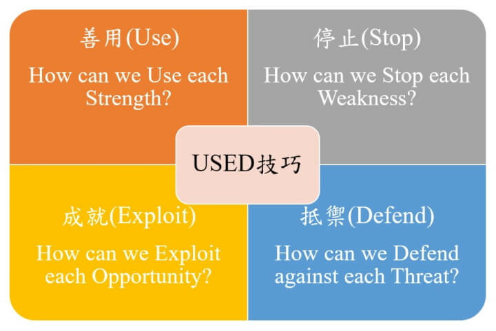 在進行完SWOT分析後,會需要用USED技巧來想出解決方案,這四個字母分別代表的是善用(Use)優勢、停止(Stop)劣勢、成就(Exploit)機會及抵禦(Defend)威脅,這部分就交由企業去反思,而大家看完這篇文後,思考的角度是不是更廣泛了呢?