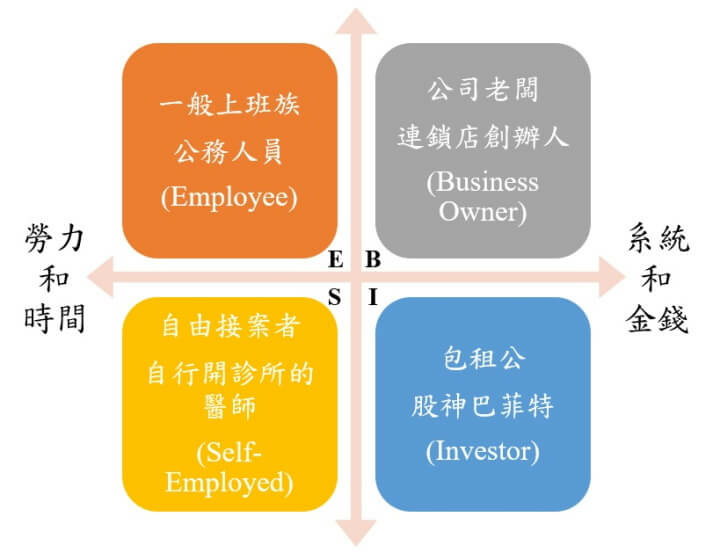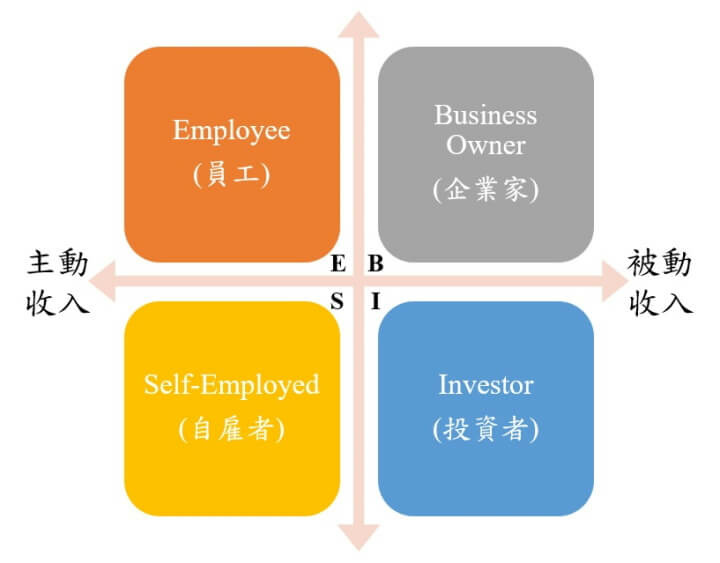 在ESBI財富四象限中,分別代表的是員工(Employee)、自雇者(Self-Employed)、企業家(Business Owner)及投資者(Investor),在左邊的E及S定義為主動收入,右邊的B及I定義為被動收入。