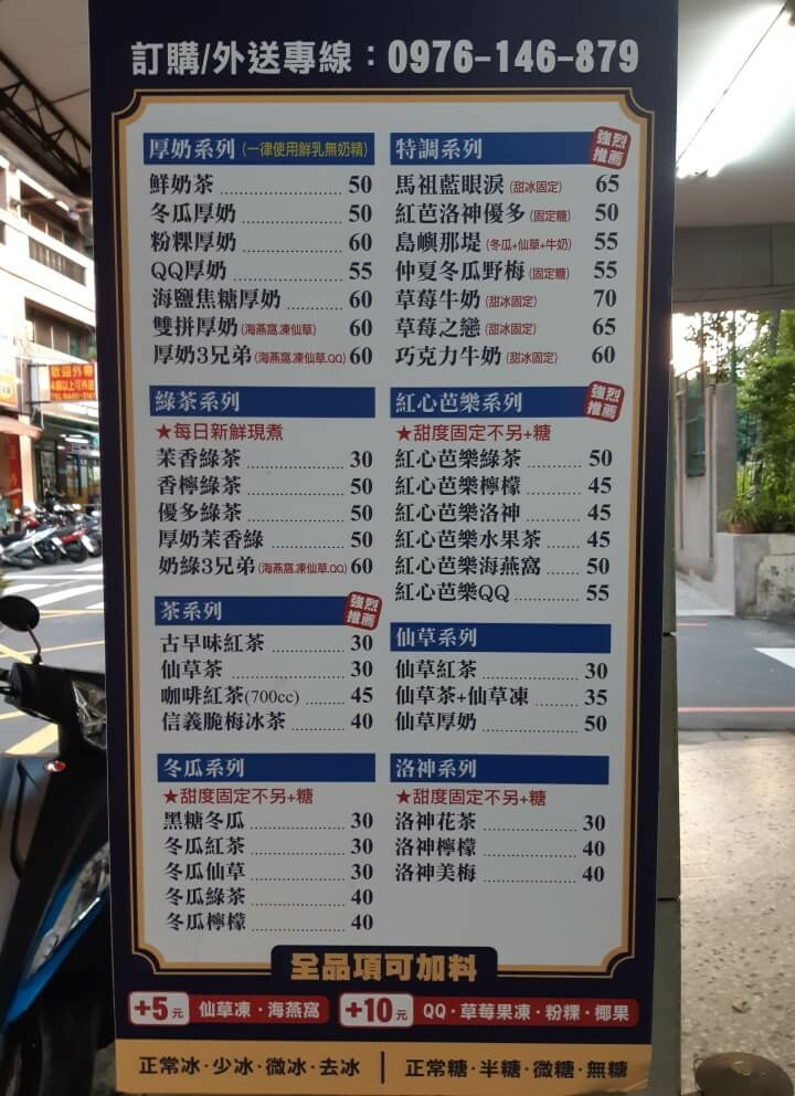 抵達目的地後先來看看菜單,飲品部分分成八大區塊,分別是厚奶系列、綠茶系列、茶系列、冬瓜系列、特調系列、紅心芭樂系列、仙草系列及洛神系列。