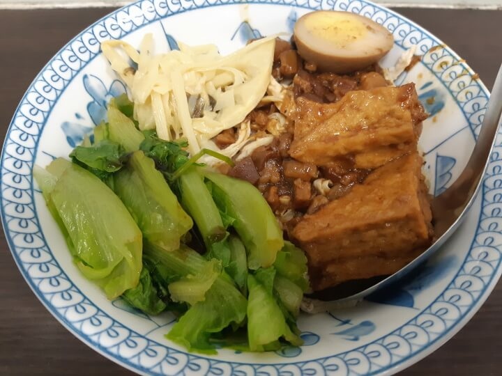 接著是雞滷飯便當,有筍干、油豆腐、燙青菜及滷蛋等配菜,整體吃起來還不賴。
