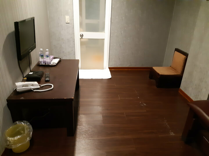 搭電梯上樓後,有工作人員會引導路線,一進門先看到電視機?!