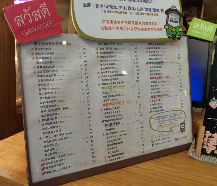 抵達目的地後先來看看菜單,飲品部分分成九大區塊,分別是泰式傳統茶飲系列、泰式椰奶系列、泰式豆奶系列、泰國華欣淡奶系列、泰式蘇打系列、原創泰國蝶豆花系列、泰國帕岸島系列、泰式瓶裝果汁及泰讚了泰有料系列。